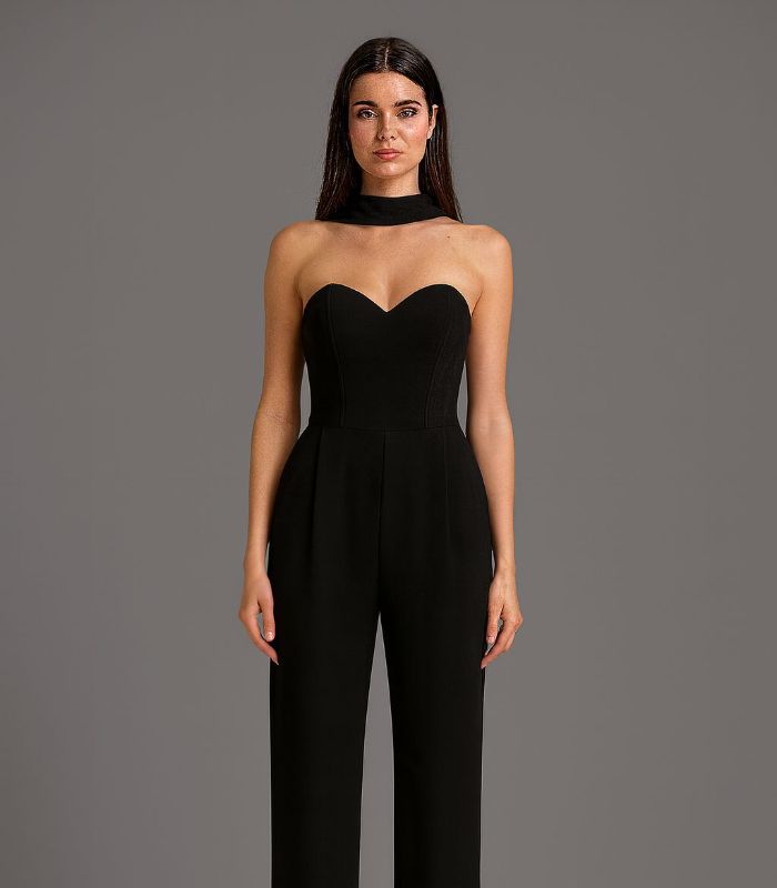 אוברול שחור בגזרת סטרפלס עם מחשוף לב, צווארון קולר צמוד ורחב ומכנס בגזרת קלוש. האוברול מגיע במידות 0-3.