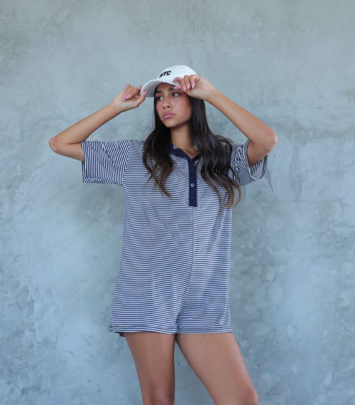 אוברול קצר ונוח בגזרת פולו עם צווארון ושסע, מגיע בוואן סייז ובצבעים שחור, לבן, כחול ואפור.