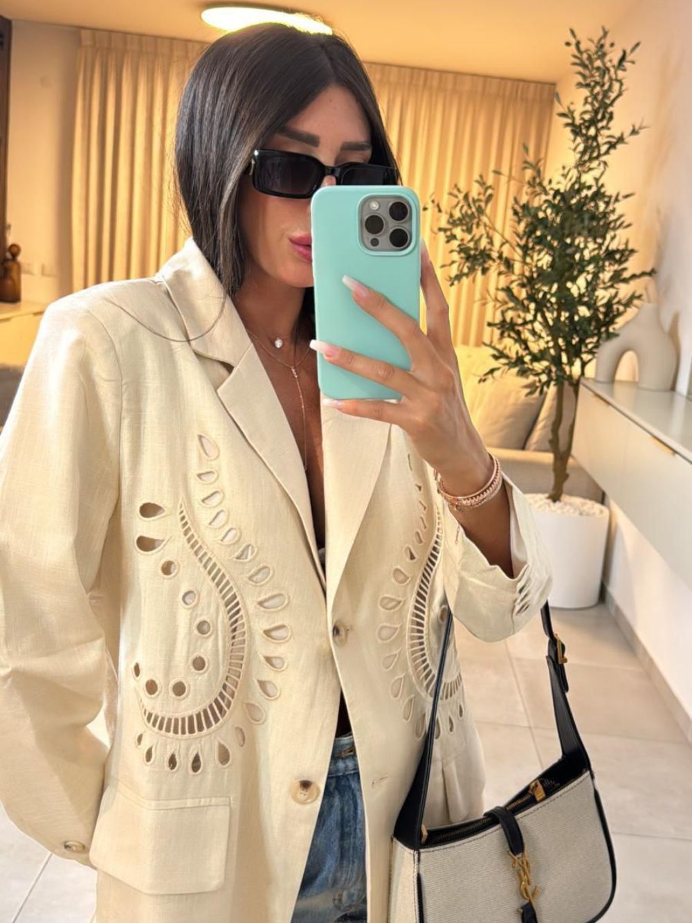 פריט חובה מהקולקציה החדשה שלנו! הג'קט בגוון שמנת מגיע בעיצוב מיוחד עם חיתוכי לייזר עדינים ושיקיים.