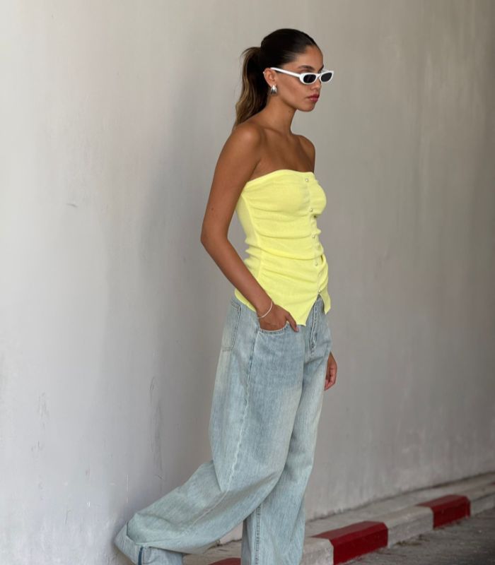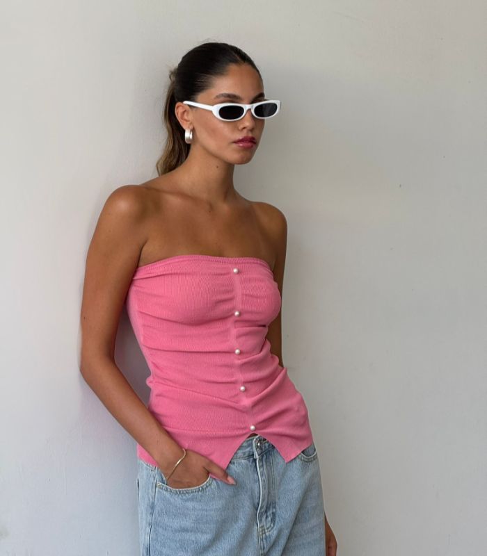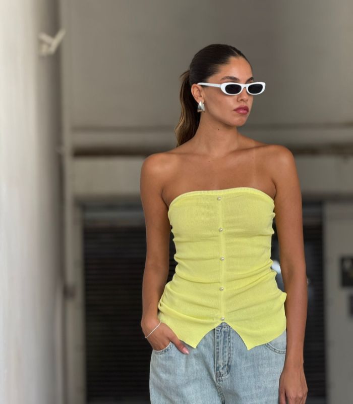 סטרפלס רוי – טופ סטרפלס בגזרת ריב צמודה ומחמיאה, עם פתח קדמי וכפתורים קטנים. הדרך הכי קלה להוסיף טאץ' של צבע ושיק לכל לוק.