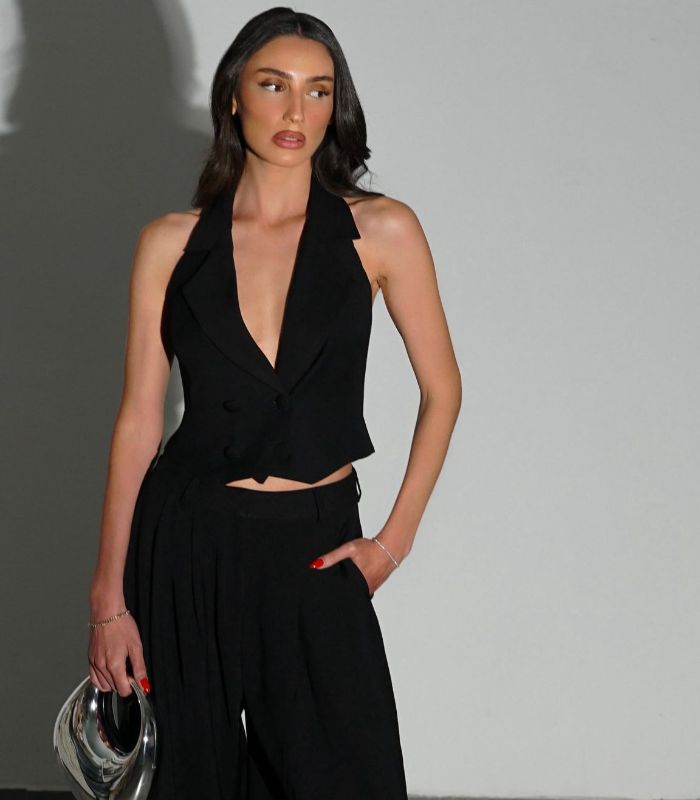 חליפת מוניקה– סט מחויט ואלגנטי, הכולל גופיית וסט מחמיאה עם כפתורים ומכנסיים רחבים בגזרה גבוהה. הסט מושלם לאירועים מיוחדים ולמראה דרמטי ומלא סטייל.