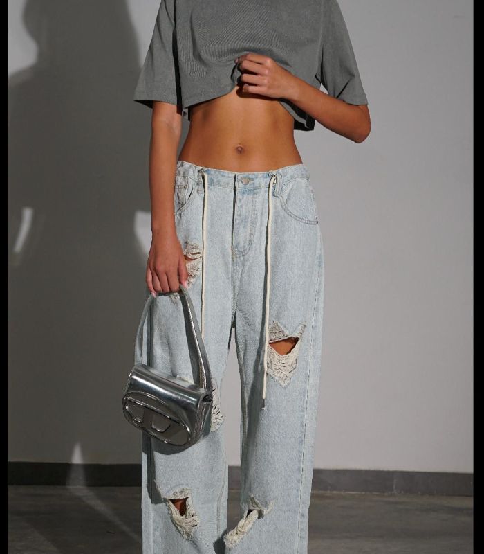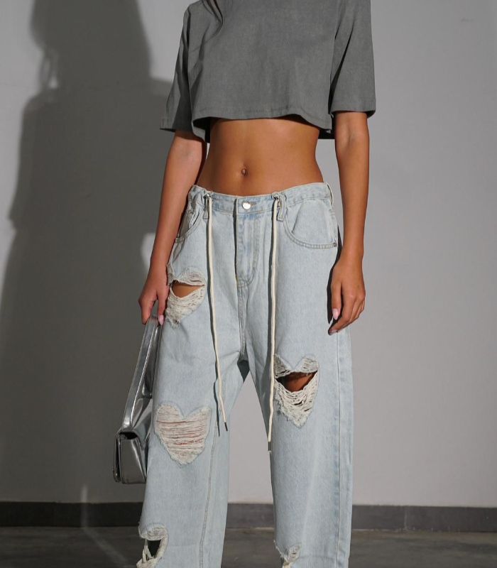 ג'ינס לבבות – ג'ינס בגזרה רחבה וקלילה, עם קרעים מעוצבים בצורת לבבות. הפריט המושלם לשדרוג כל מראה בטאץ' שובב וטרנדי.