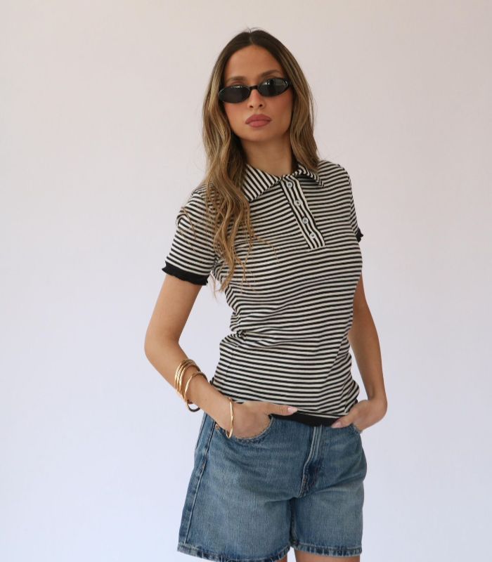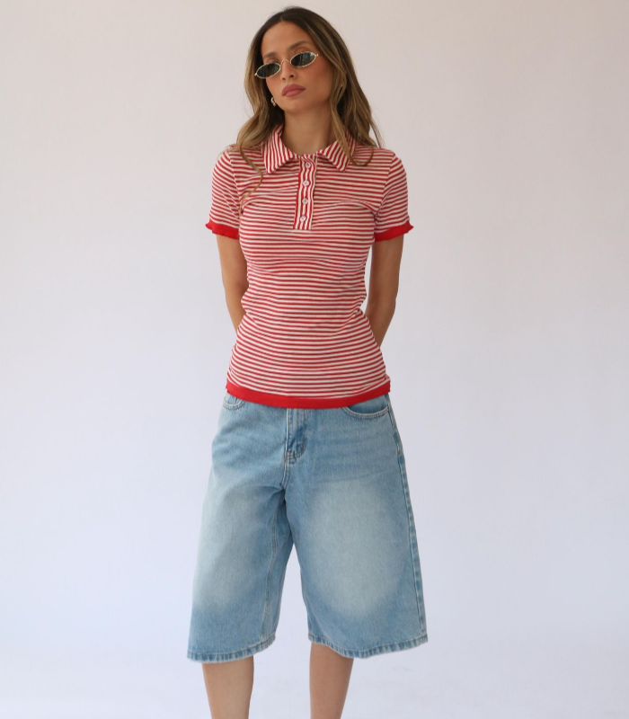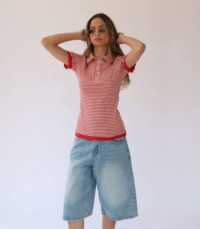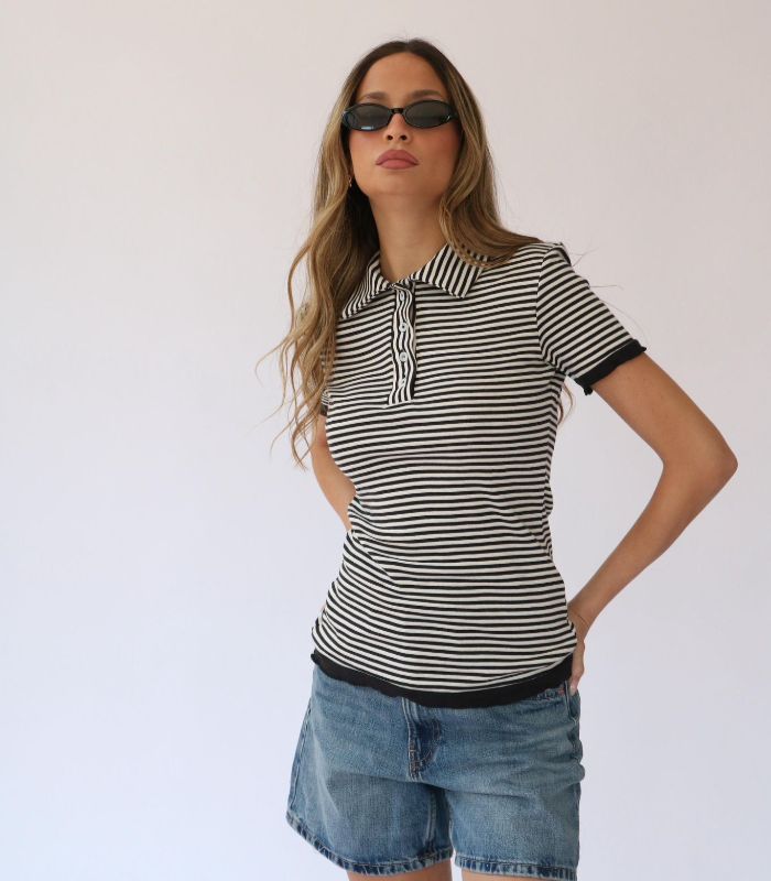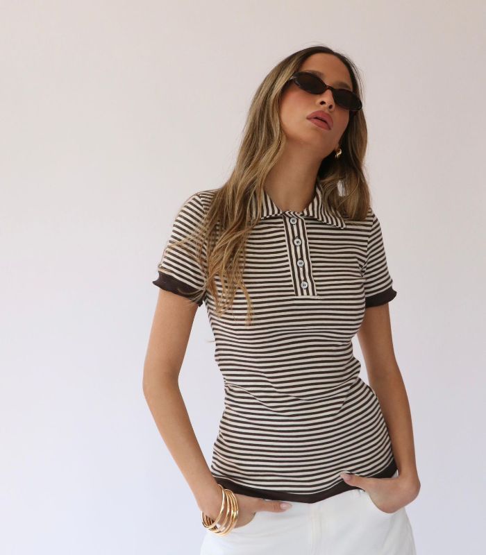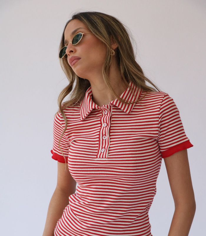 חולצת פולו קצרה עם הדפס פסים, שרוולים ומפתח צווארון. החולצה מגיעה במידות S/M ו-M/L ובצבעים שחור, אדום וחום.