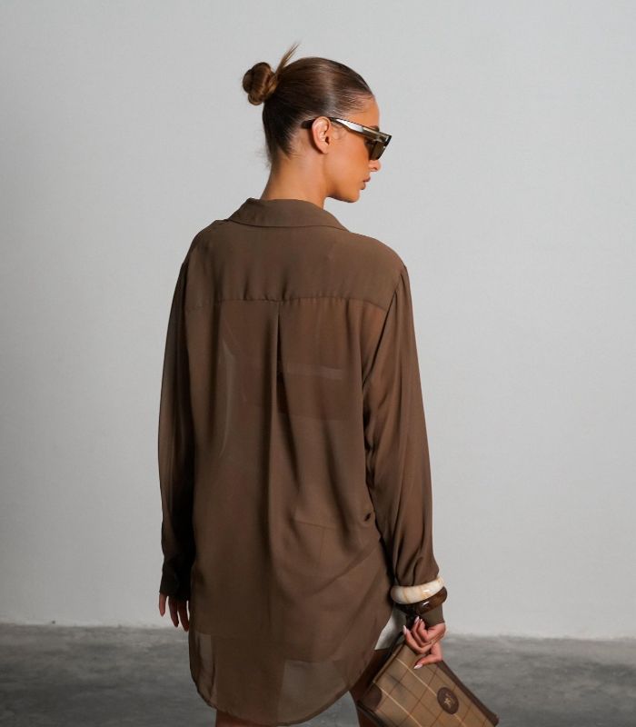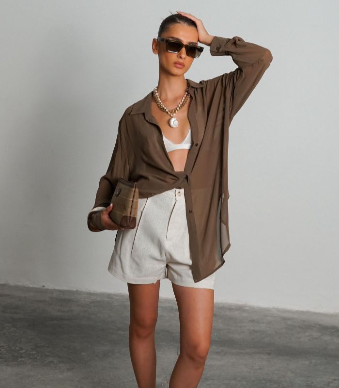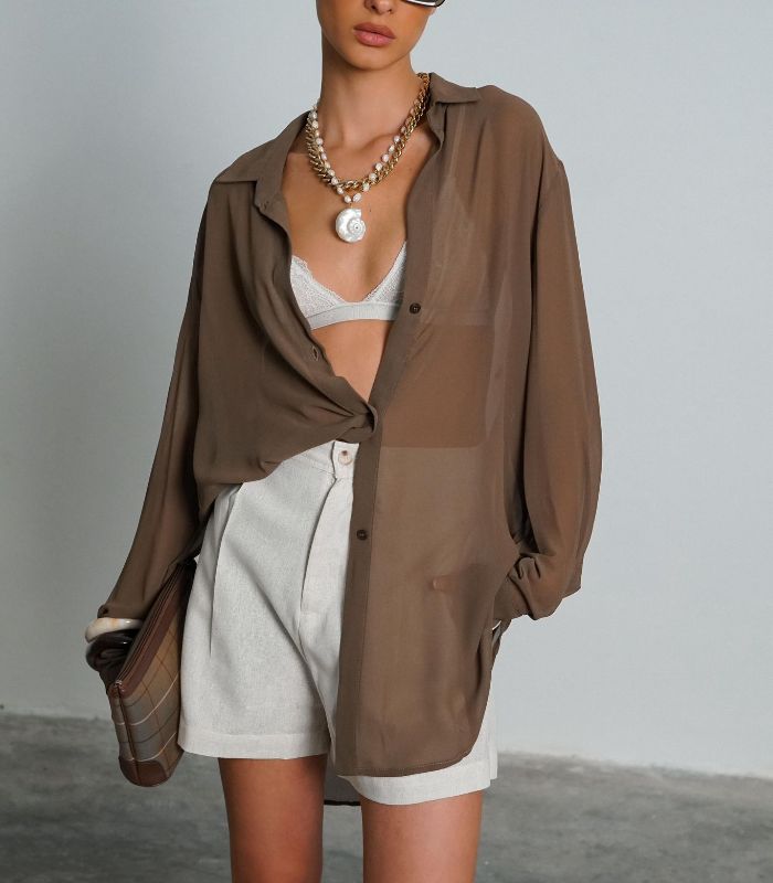 חולצת אריקה – חולצה מכופתרת ושקופה שתמיד תיראה יוקרתית. הגזרה הנינוחה והבד הנשפך הופכים אותה לפריט מנצח בארון.