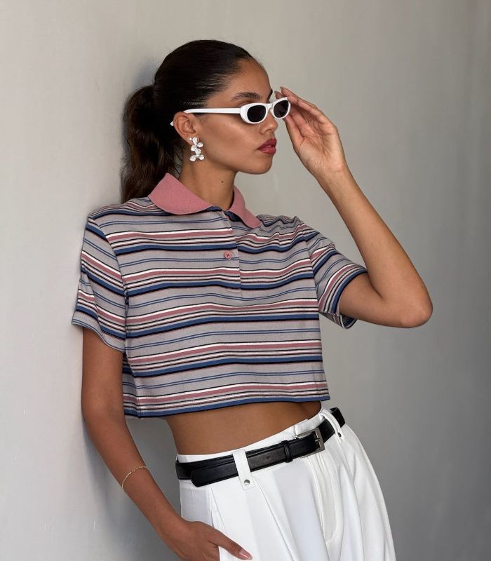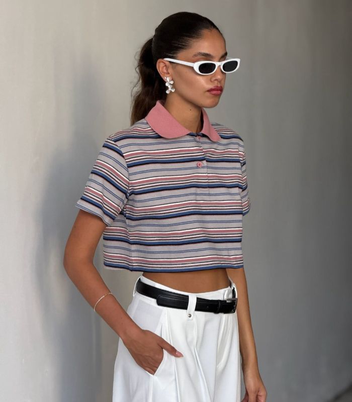 חולצת דניאל – חולצת פולו קרופ פסים קלאסית, עם צווארון ורוד שמכניס טוויסט צבעוני וייחודי. מושלמת למראה קז'ואל-שיק עדכני.