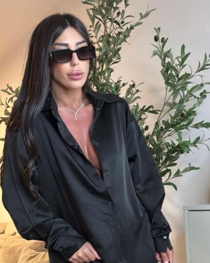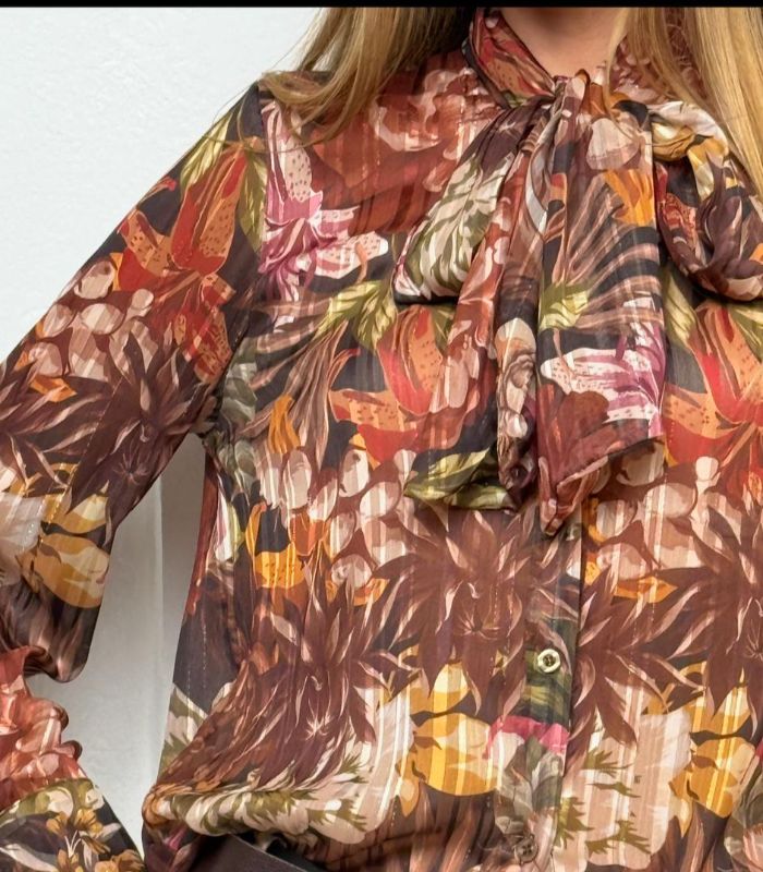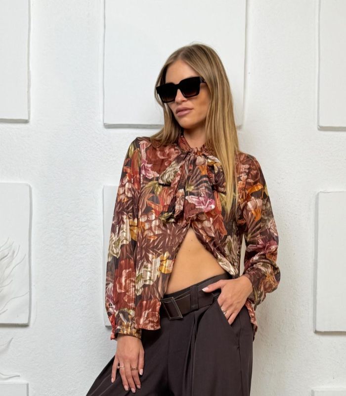 חולצת משי חגיגית עם הדפס פרחוני, שרוולים ארוכים, קשירה בצוואר ואלמנט לורקס עדין. החולצה מגיעה בוואן סייז ובצבע חום.