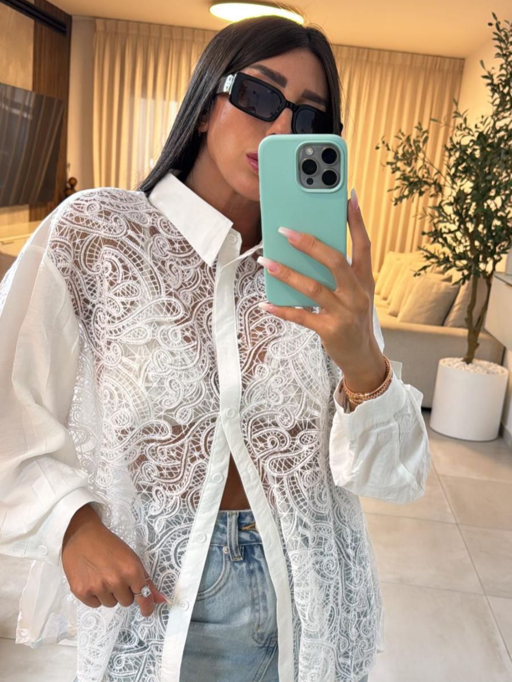 חולצה מכופתרת יוקרתית ושיקית עם פאטרן תחרה בולט וייחודי.