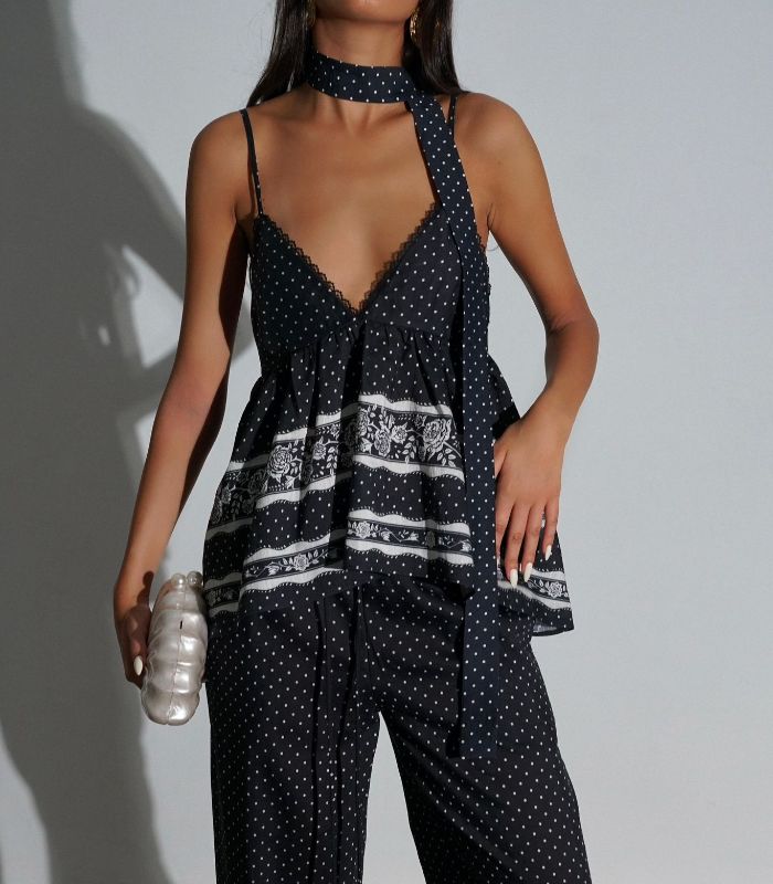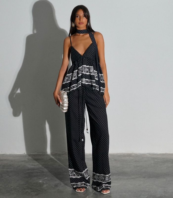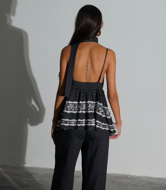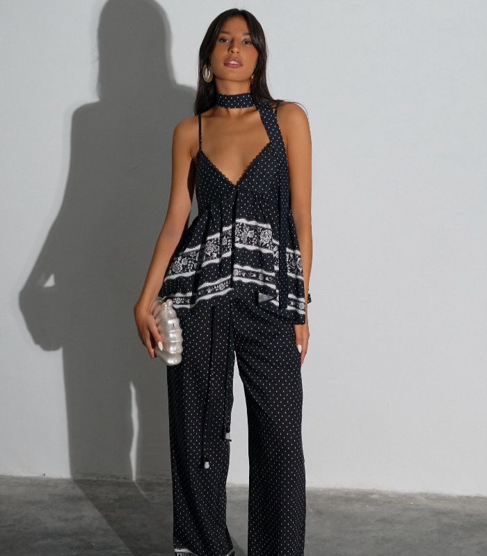 חליפת פנאי קייצית וקלילה בשילוב הדפס נקודות ופסים. החליפה כוללת גופיית ספגטי עם קשירה במחשוף ומכנס ארוך ונוח. החליפה מגיעה במידות סמול ומדיום ובצבע שחור.