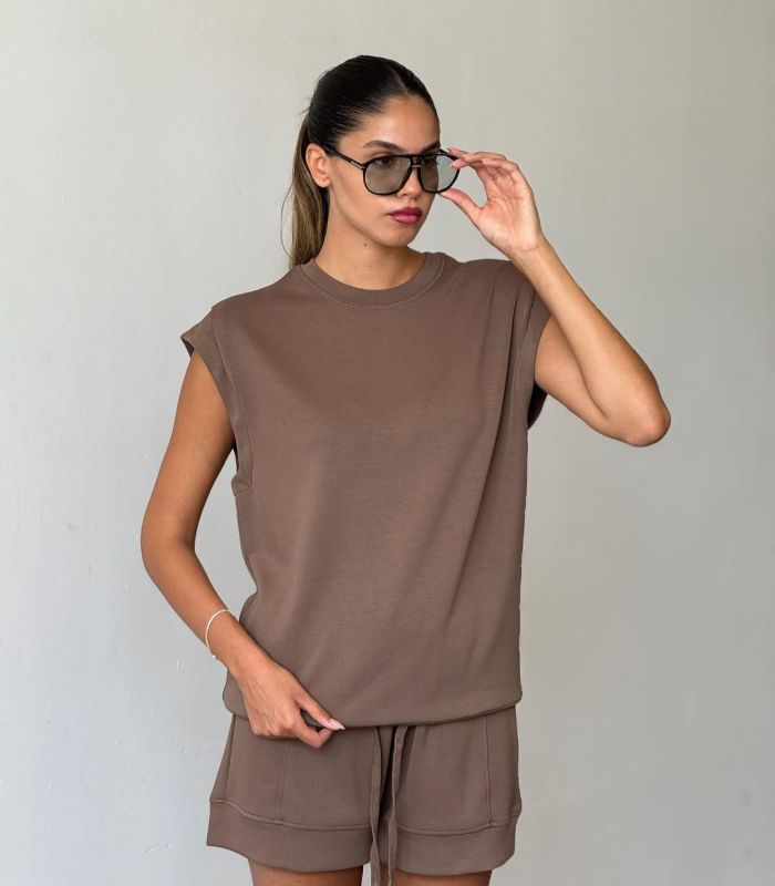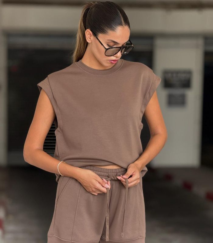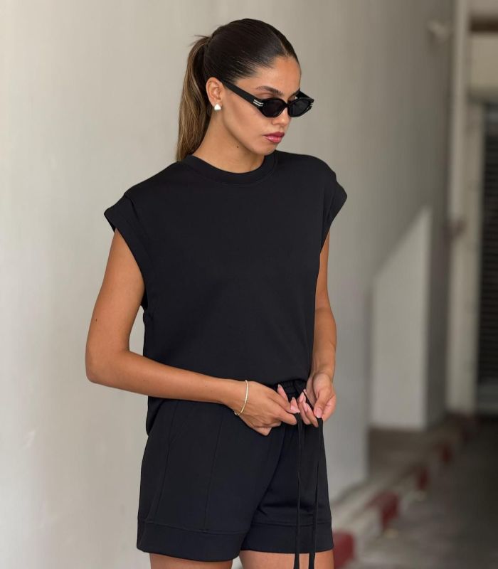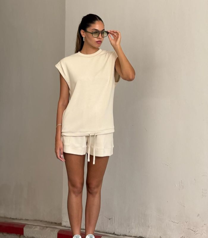 חליפת טאי  – סט שני חלקים מושלם שמשלב בין נוחות מקסימלית לסטייל מוקפד. החליפה כוללת טי-שירט בגזרת אוברסייז עם כריות כתפיים ומכנסיים קצרים עם שרוך קשירה.