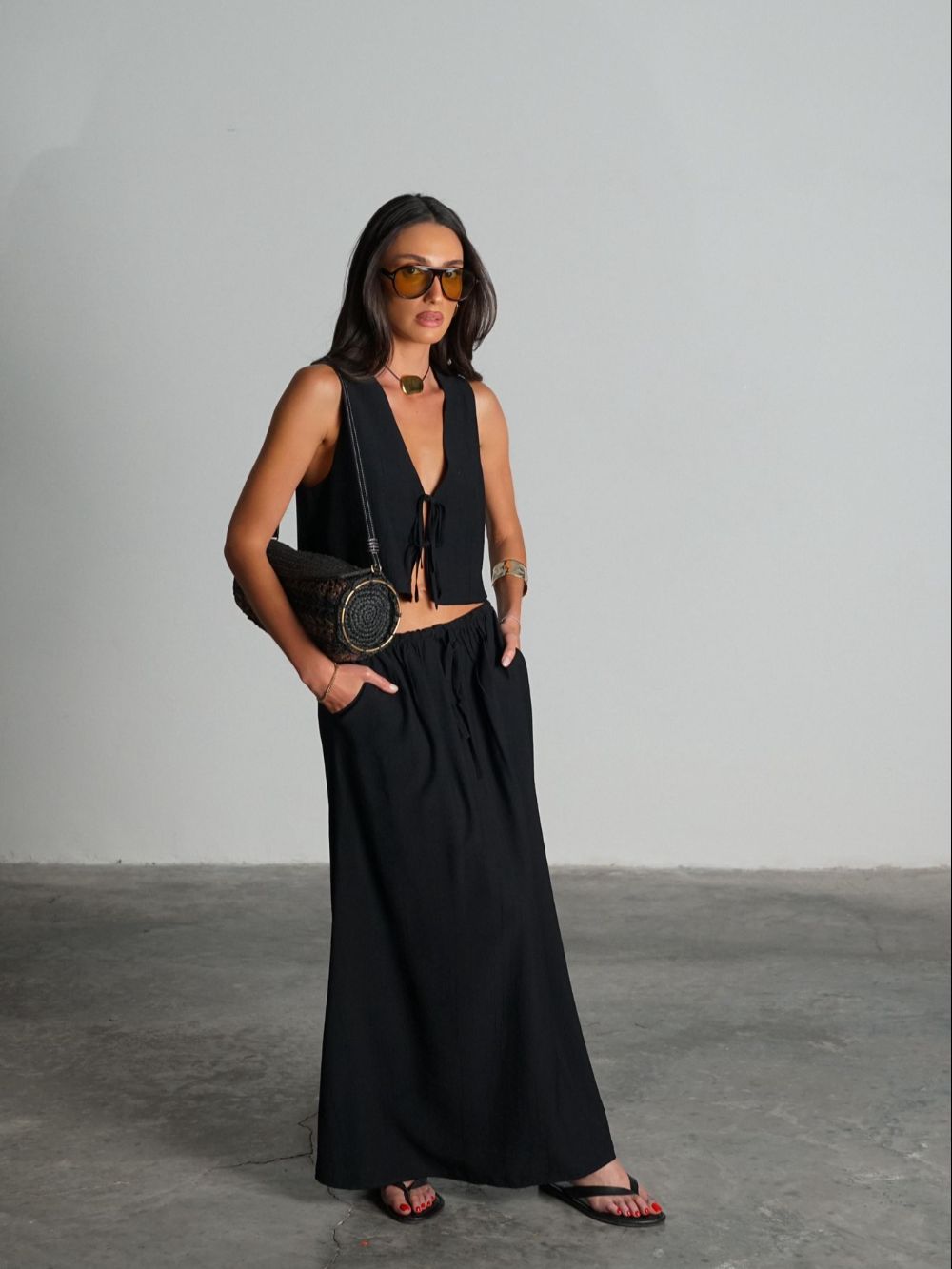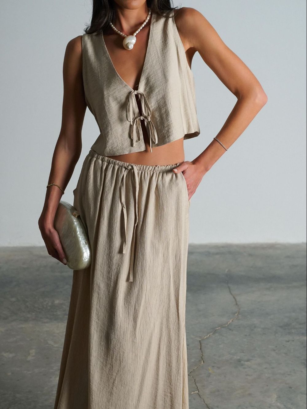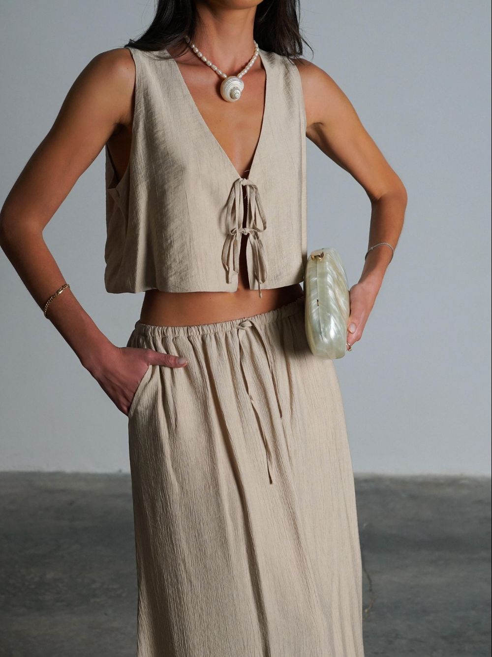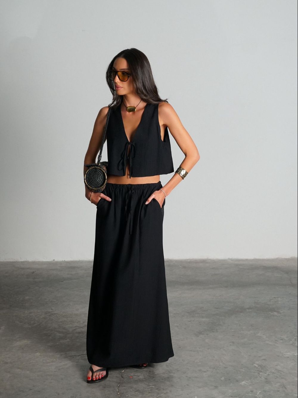 הסט מורכב מחולצת קשירה וטופ תואם, ומכנסיים בגזרה רחבה שיוצרים מראה קליל, אוורירי ושיקי.