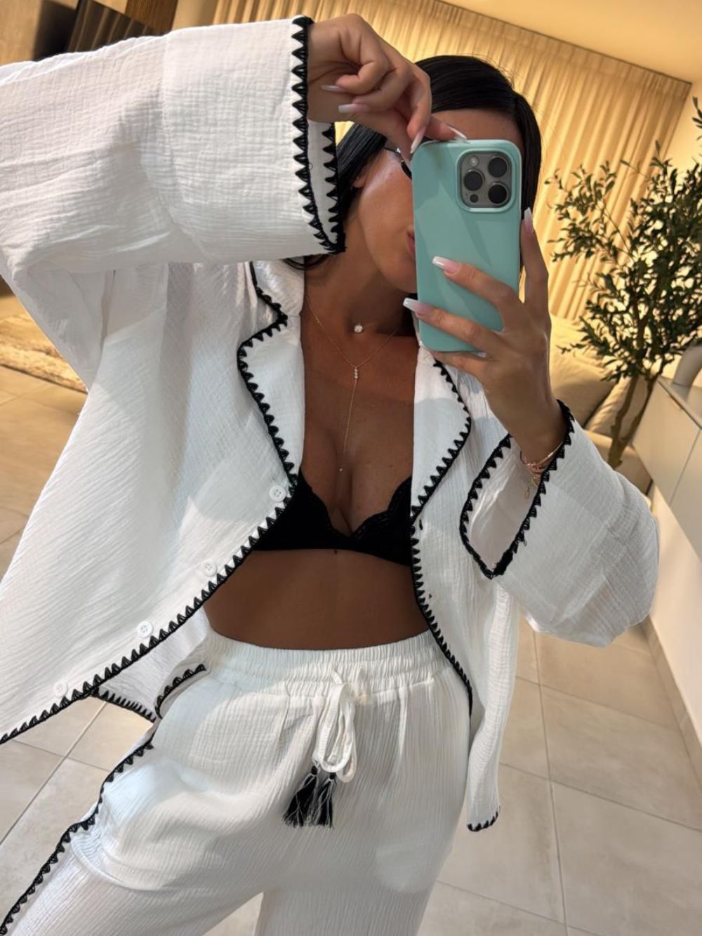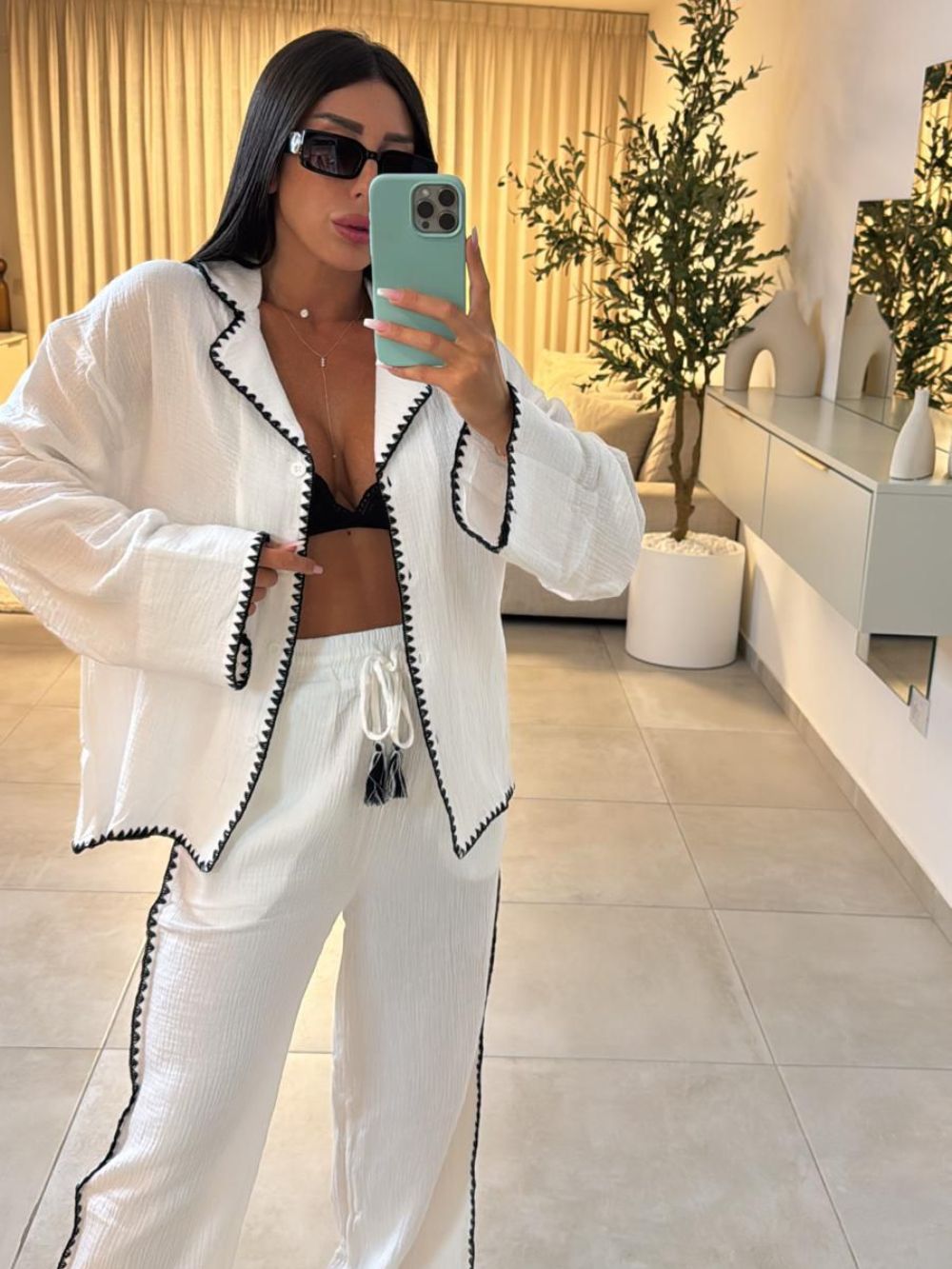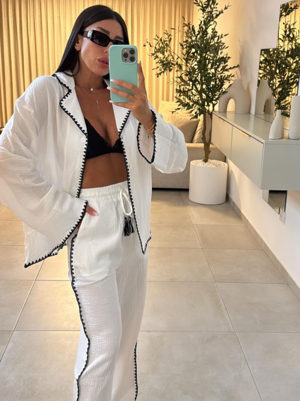 הכירו את הסט המושלם שמשלב בין נוחות לסטייל! חליפת "תיפורים" ארוכה ואוורירית בגוון לבן,