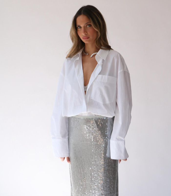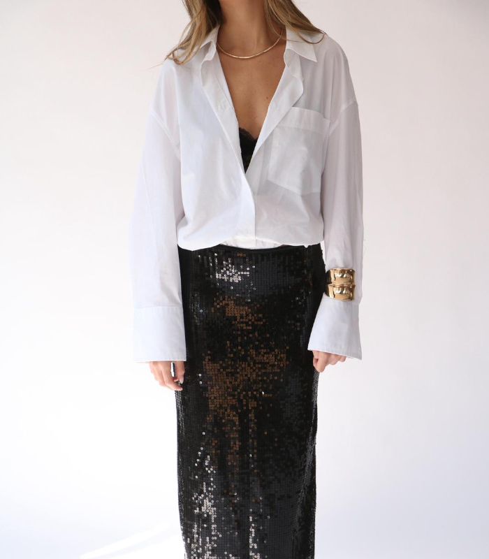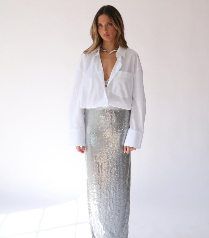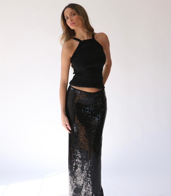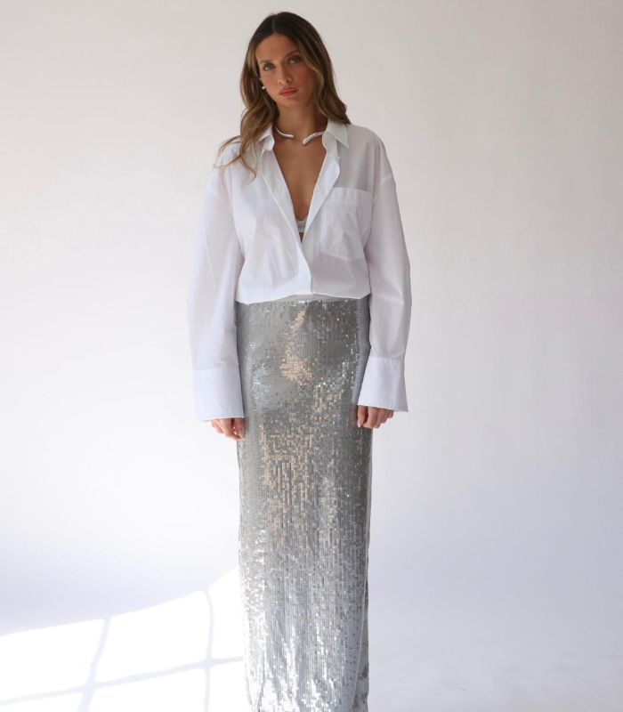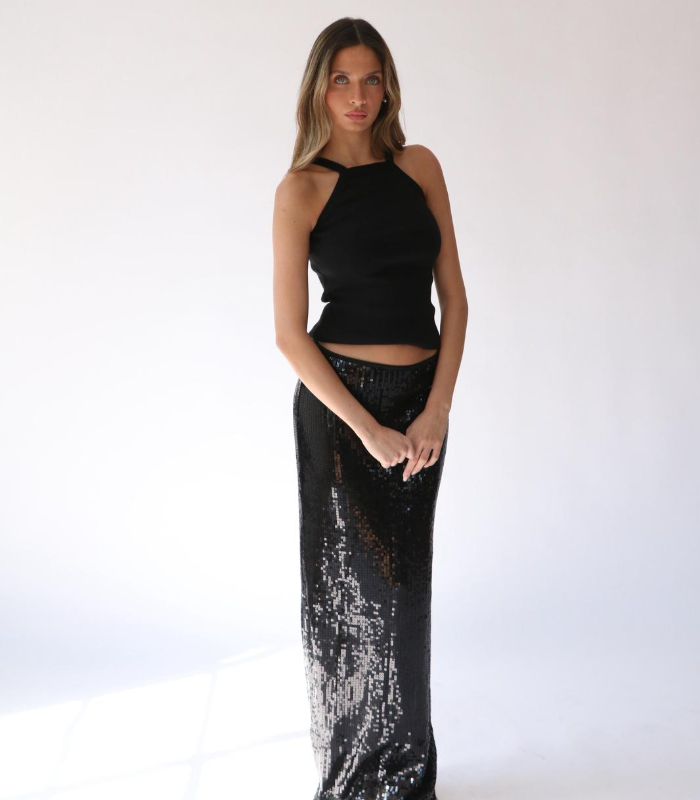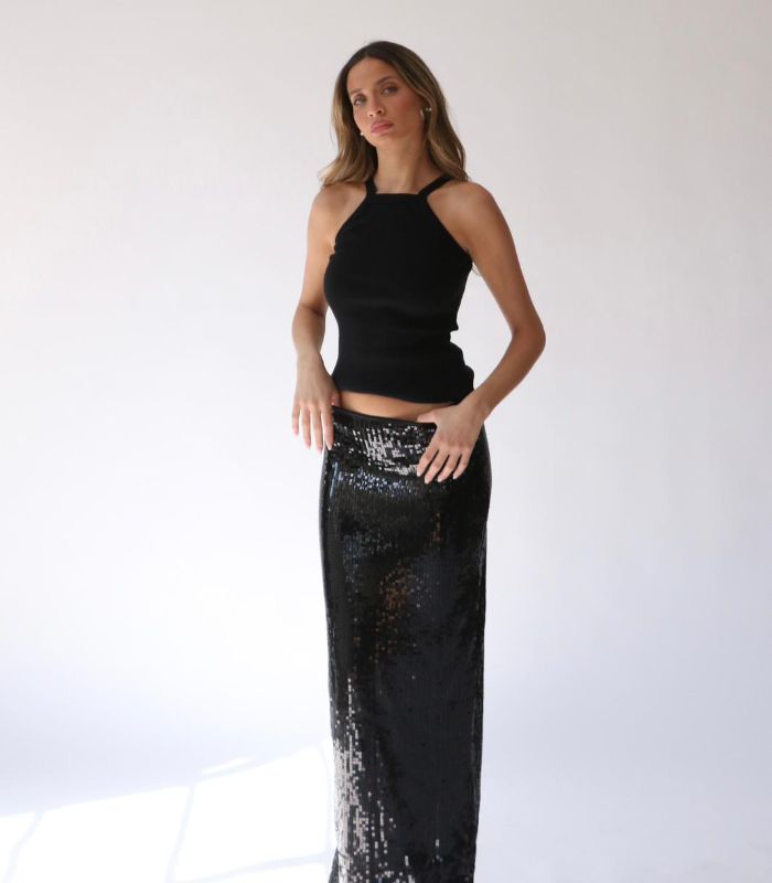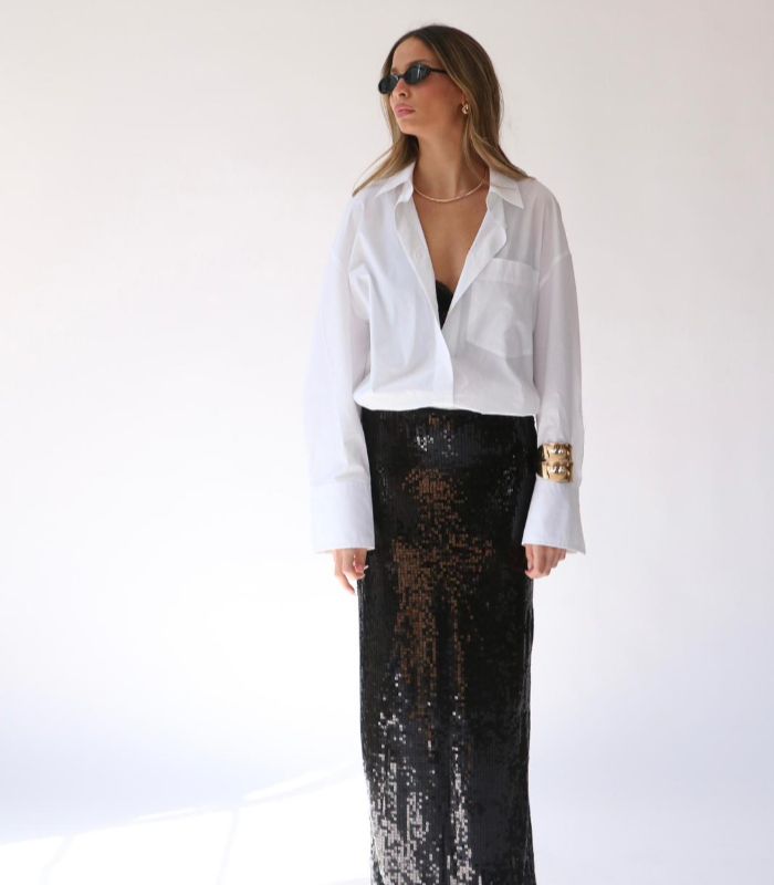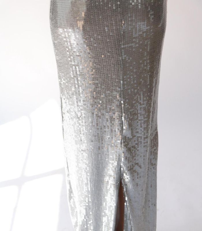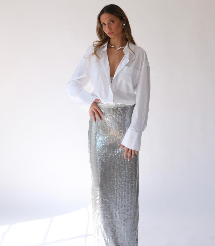 חצאית פייטו – חצאית מקסי ישרה עם נוכחות בלתי מתפשרת. החצאית עשויה כולה פאייטים נוצצים בצבעי שחור וכסף, ומושלמת ליצירת לוק ערב דרמטי.