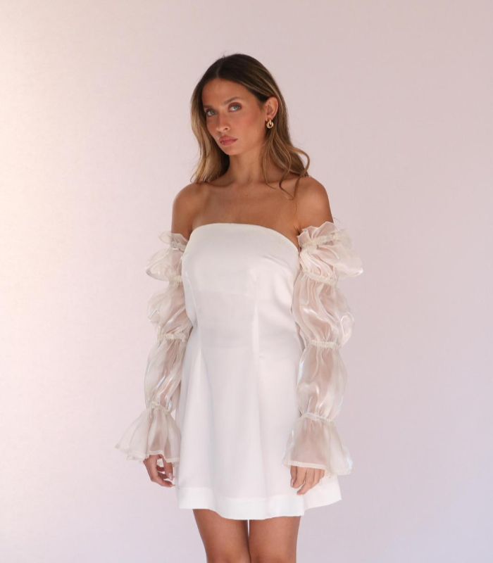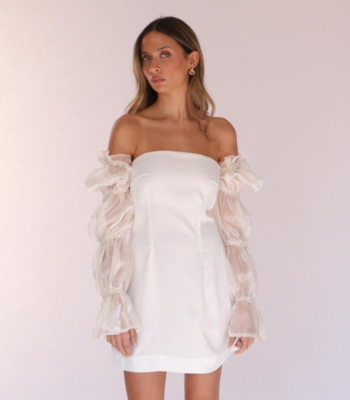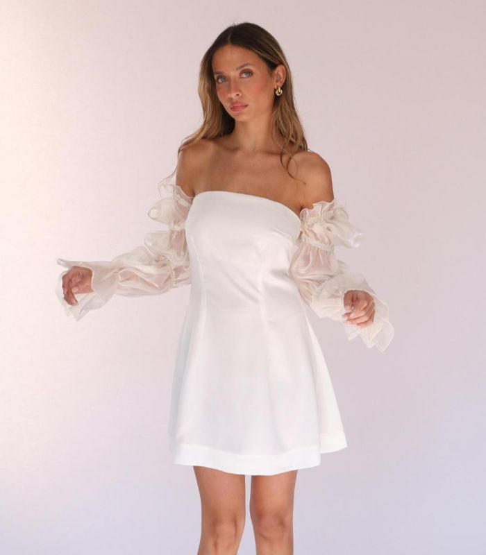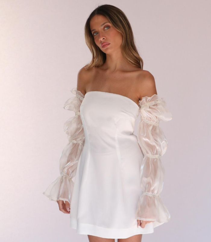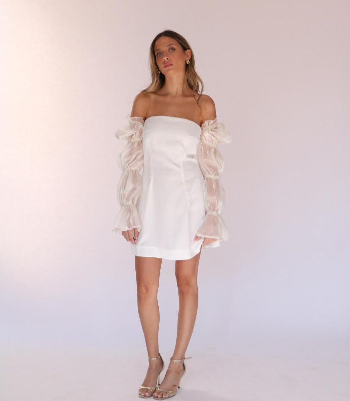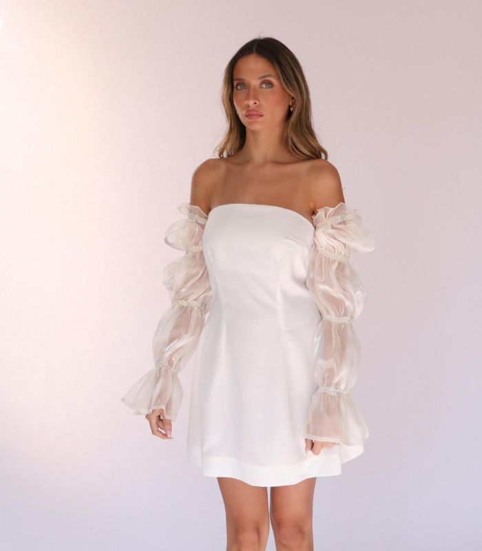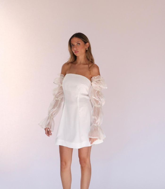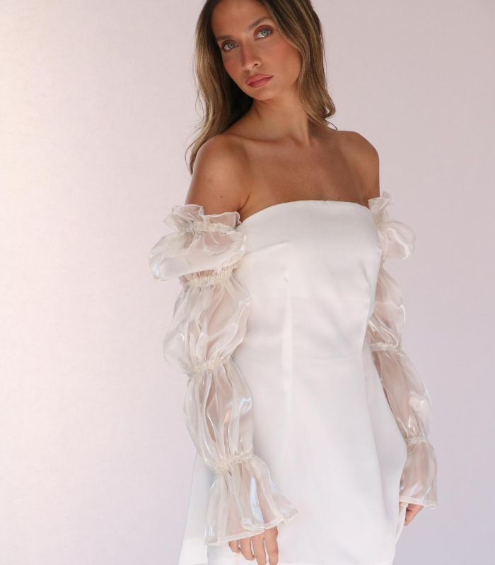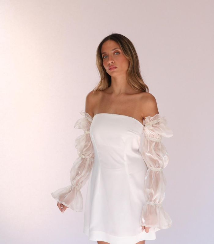 שמלת מירל – שמלת מיני סטרפלס בגזרת A, הכוללת שרוולים נפרדים ורומנטיים שניתנים להסרה. מושלמת לאירועים ולמסיבות.