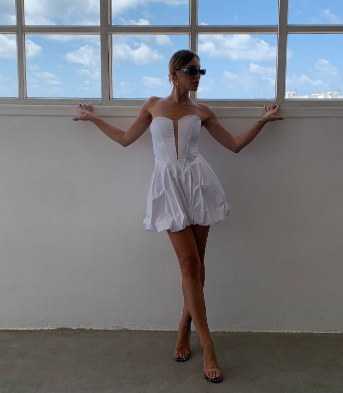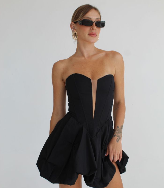 שמלת סטרפלס שוקולד בגזרת מחוך מחמיאה עם חצאית נפוחה – שילוב מושלם של שיק ונועזות.