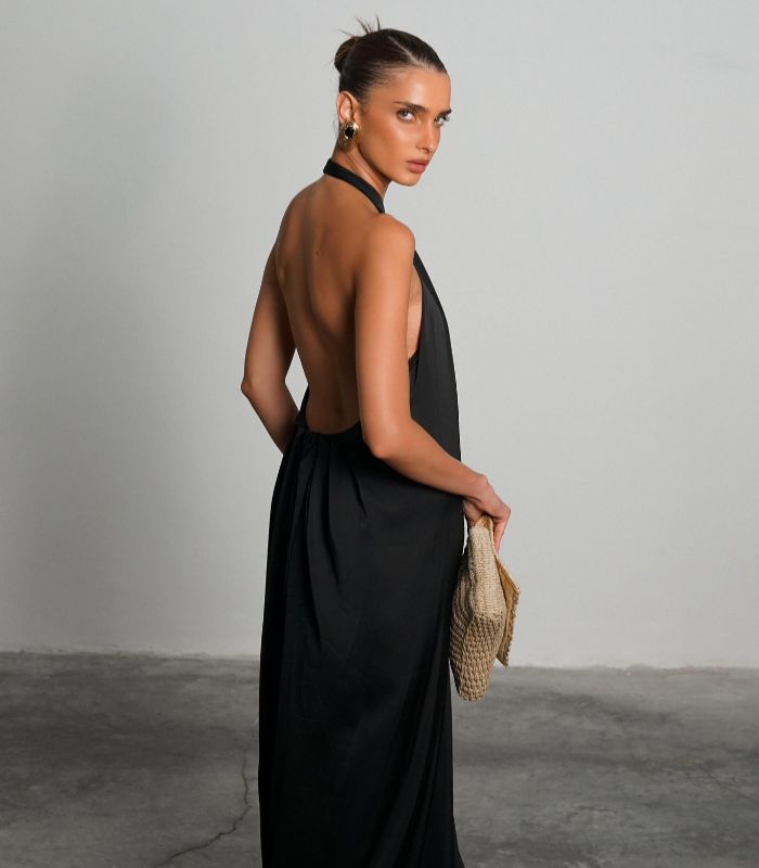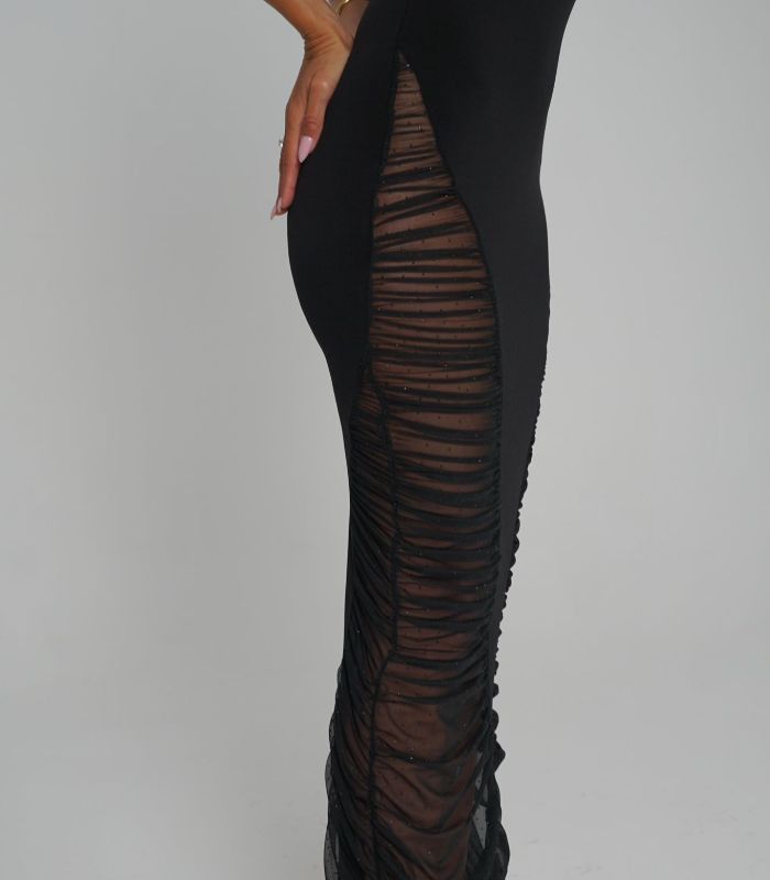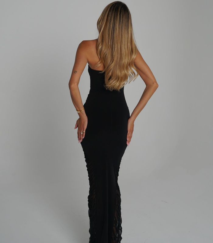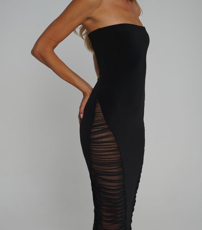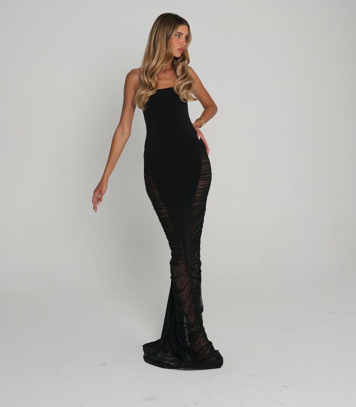 שמלת מקסי שחורה בגזרת סטרפלס צמודה עם מחשוף לב, מחמיאה ומחטבת. השמלה מעוטרת בד טול שקוף וקפלים צידיים לאורכה, היוצרים מראה דרמטי וייחודי. שמלה מושלמת לאירועי ערב יוקרתיים.