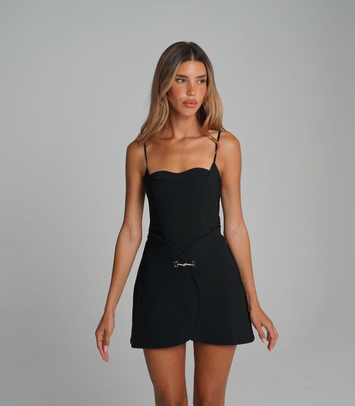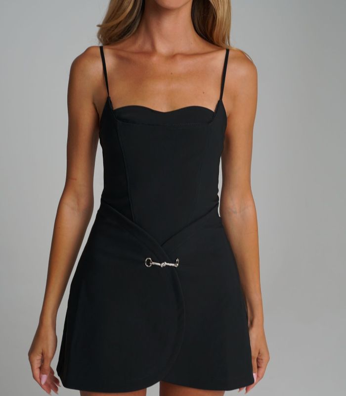 שמלת Lerian– שמלת מיני סטרפלס בגוון שחור, עם גזרה מחמיאה ומחוייטת. השמלה מעוטרת בפרט כסוף מיוחד בחלק התחתון, שיוצר מראה ייחודי ואלגנטי.