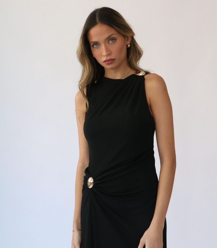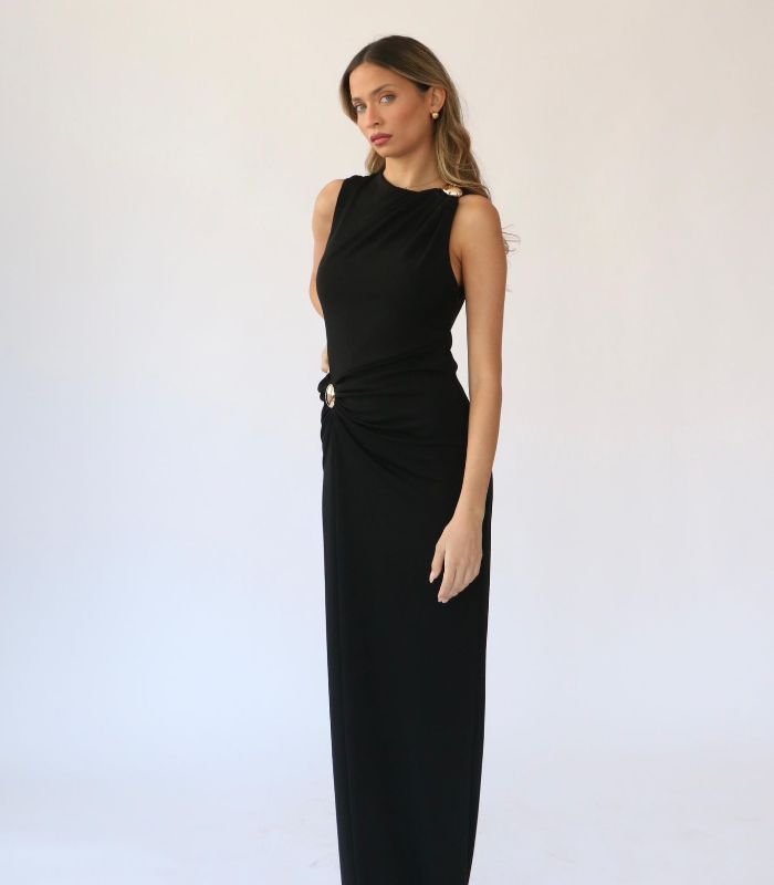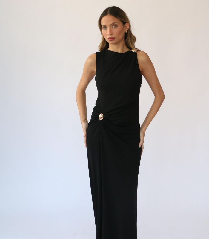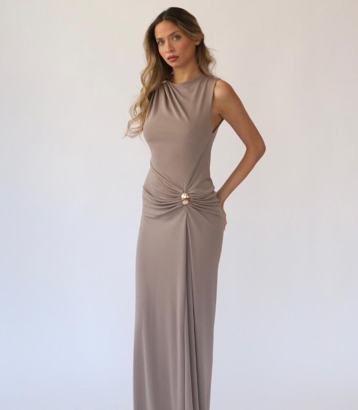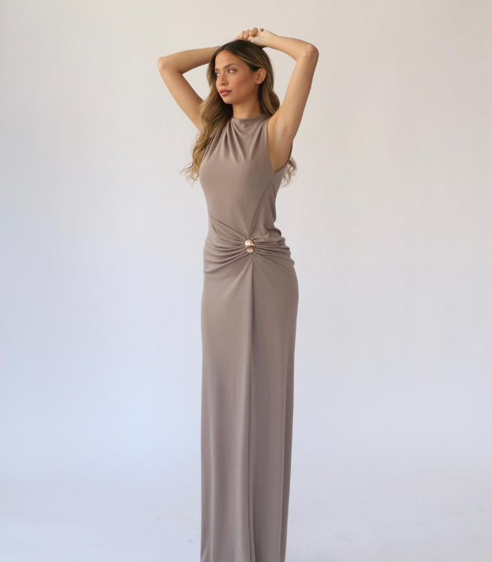 שמלת מקסי בגוון חום, בגזרת מעטפת עם מחשוף עגול ועמוק וגב חשוף, מעוטרת באבזם מוזהב במותן. שמלה קלאסית ומהודרת לאירוע ערב, המגיעה בצבעים שחור וחום