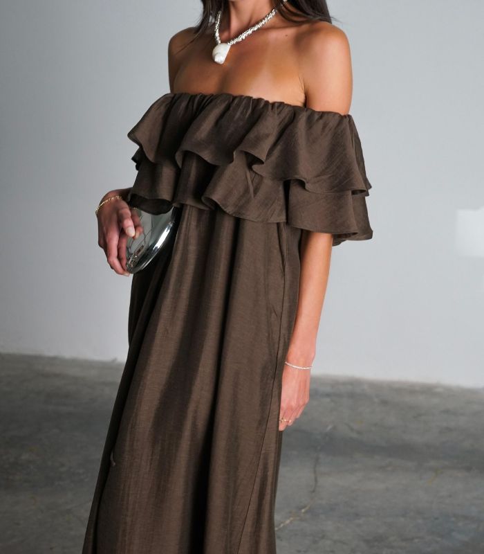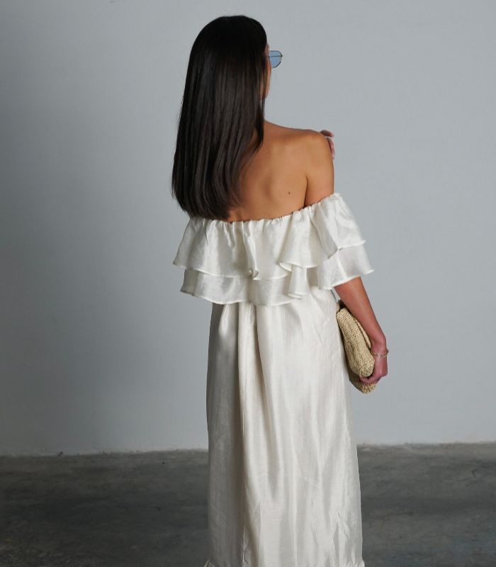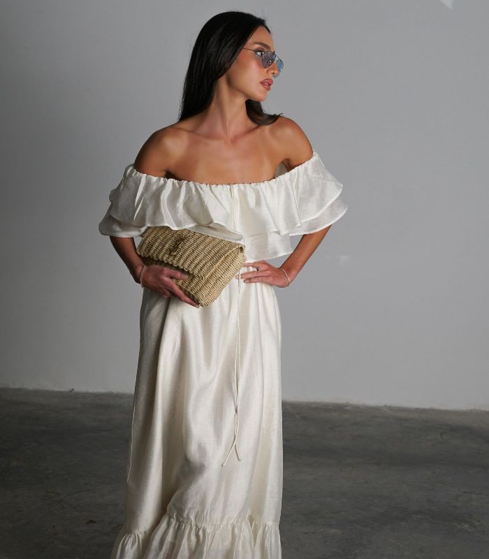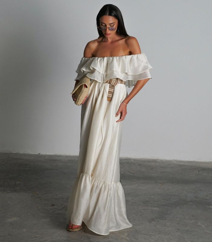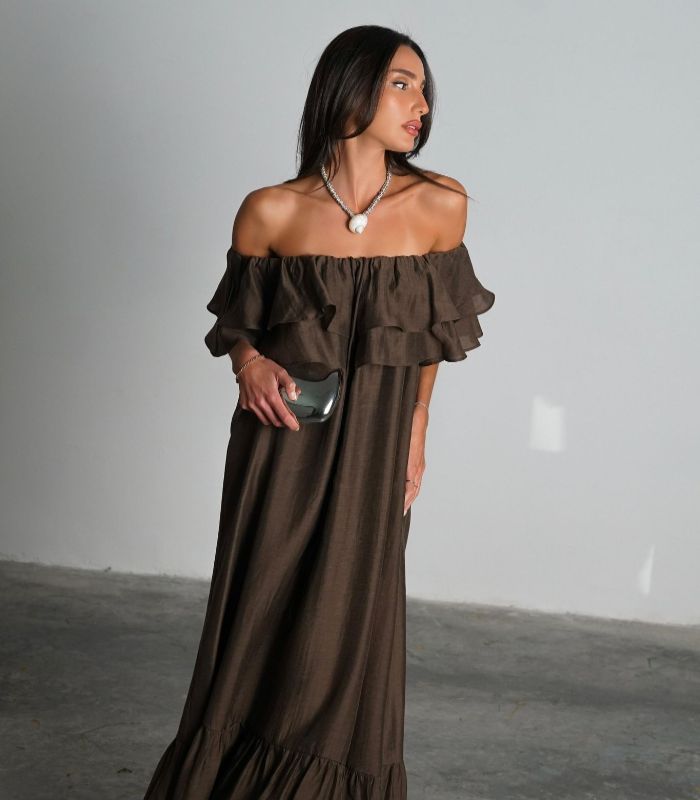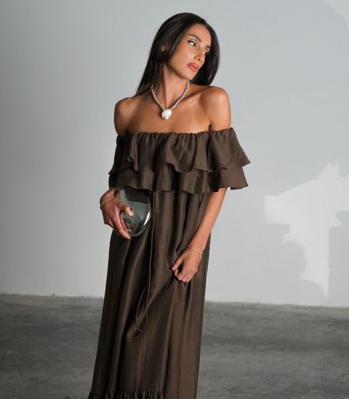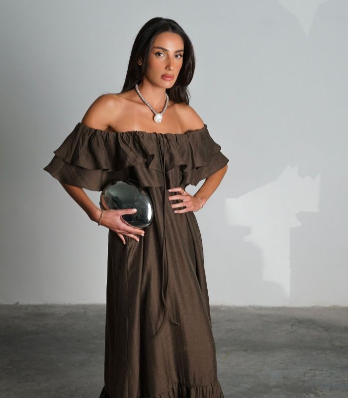 שמלת מלוני – שמלת מקסי נשית וקלילה עם מפתח כתפיים רחב ועיטורי מלמלה עדינים בחלק העליון. השמלה בעלת גזרה מתרחבת ומשוחררת, ומושלמת למראה רומנטי ואלגנטי.