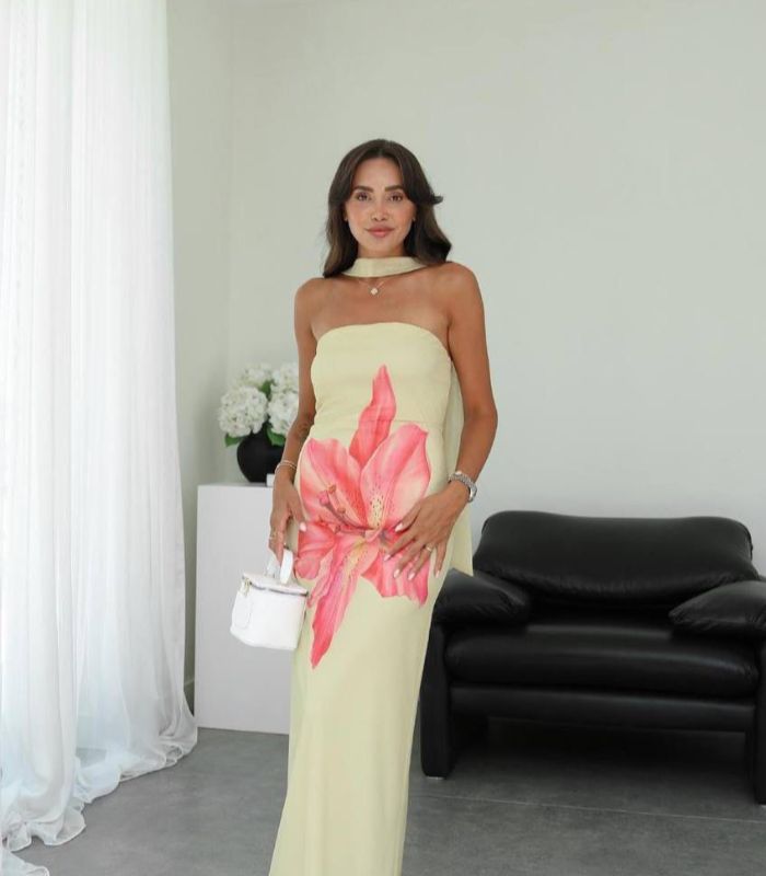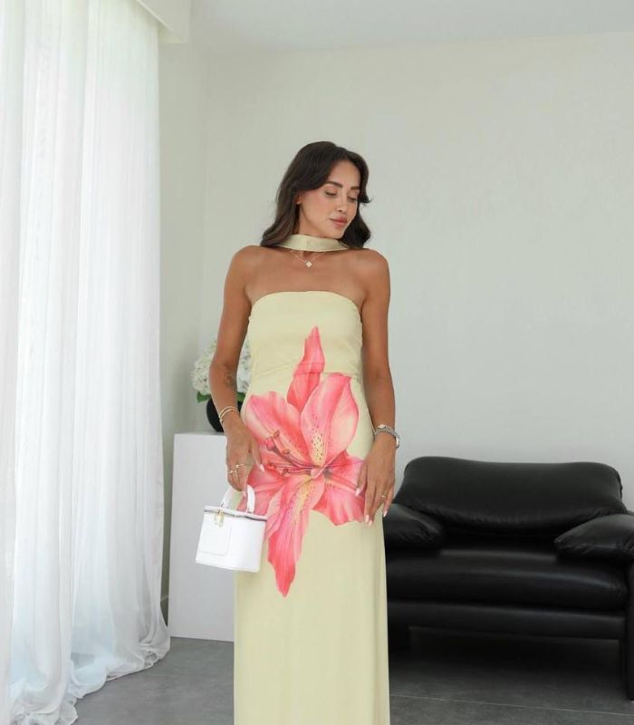 שמלת מקסי בגוון צהוב בהיר עם מחשוף סטרפלס, צווארון קולר וקשירה בגב. השמלה מעוטרת בהדפס פרחוני בגווני ורוד. שמלה קלאסית ונוחה המגיעה במידות S, M ו-L.