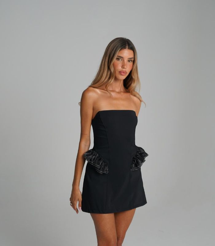 שמלת lines – שמלת מיני סטרפלס שחורה ויוקרתית, בגזרת וואן סייז שמתאימה עד מידה 38. השמלה כוללת גזרה צמודה ומחמיאה ועיטורי קפלים מדורגים בצידיה, מה שהופך אותה לפריט ערב מתוחכם וייחודי.